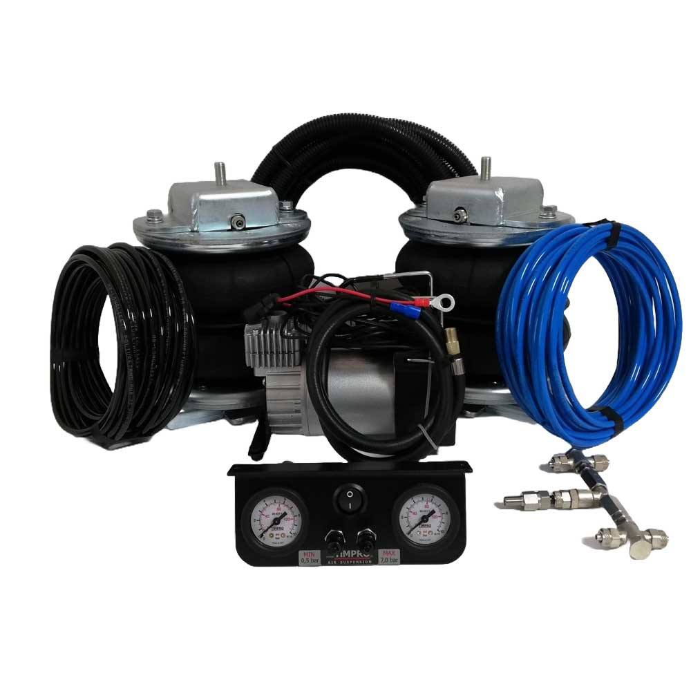 Set vsebuje 2x zračne blazine Rubena 170-2, kovinske nosilce, kompresor 12v, kontrolno ploščo za vgradnjo ob sedežu, set priključkov z dvema nepovratnima ventiloma, 2x10 metrov zračne cevi in ostali montažni material.