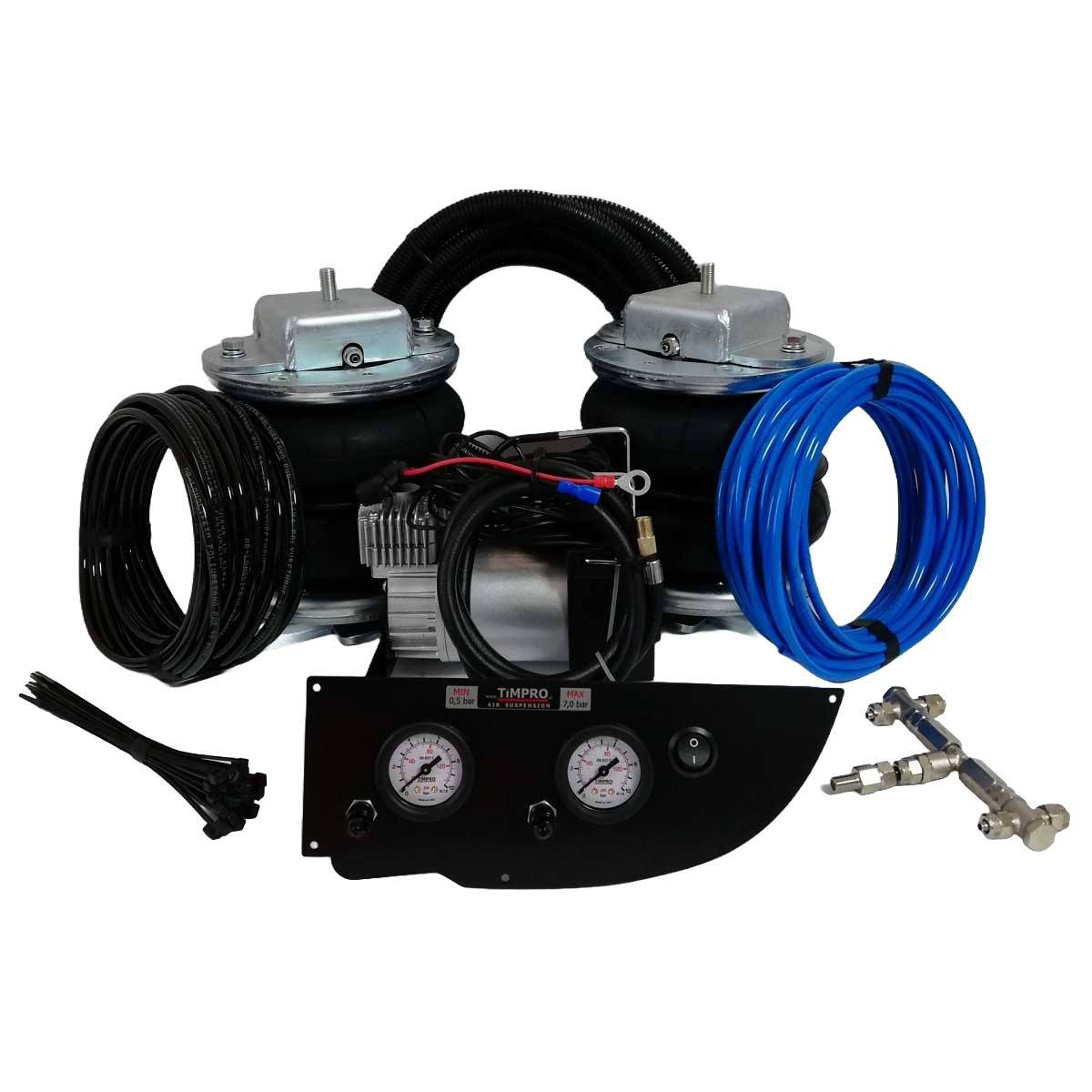 Set vsebuje 2x zračne blazine Rubena 170-2, kovinske nosilce, kompresor 12v, kontrolno ploščo za vgradnjo v armaturo (RHD), set priključkov z dvema nepovratnima ventiloma, 2x10 metrov zračne cevi in ostali montažni material.
