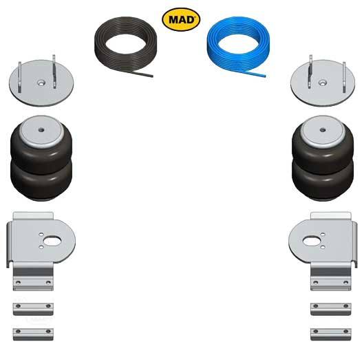 Set vsebuje 2x zračne blazine, kovinske nosilce, pnevmatske cevi in 2x ventila.
