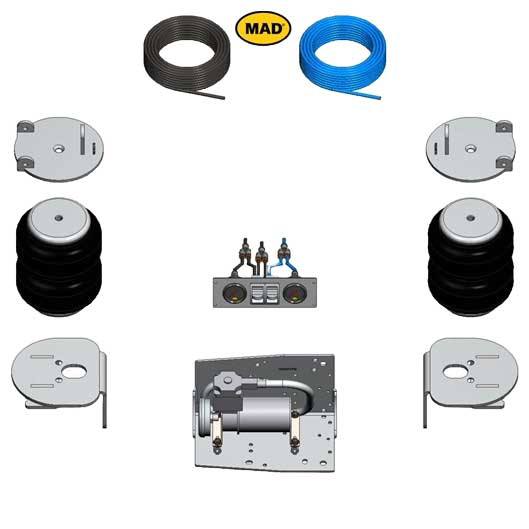 Set vsebuje zračne blazine, nosilce, kompresor, kontrolno ploščo z manometri, pnevmatsko cev in priključke.